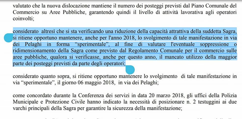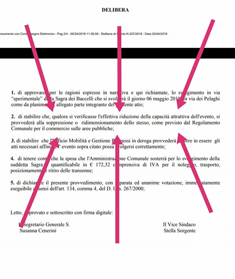Tutti valori, quelli che ho sin qui raccontato, che a mio avviso sono ben riassunti e rappresentati questa Festa che non si merita assolutamente, sia per la sua storia ed anche per la partecipazione popolare, i toni distaccati e le inaccettabili ipotesi contenute nella delibera di Giunta che pubblico. Un documento nel quale, parlando proprio della Festa dei Baccelli si legge che “si stabilisce che, qualora si verificasse l’effettiva riduzione della capacita attrattiva dell’evento, si provvederà alla soppressione o ridimensionamento dello stesso…”.