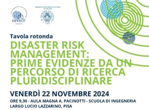 Pisa, 16 novembre 2024 – “Disaster risk management: prime evidenze da un percorso di ricerca pluridisciplinare” – Venerdì 22 novembre 2024, ore 9.30 – Aula Magna A. Pacinotti – Scuola di Ingegneria (Largo Lucio Lazzarino, Pisa).