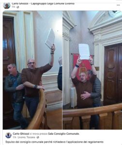 Poi poco dopo posta altre due foto che lo ritraggono mentre viene espulso e grida tutta la sua contrarietà. Il consigliere comunale del carroccio scrive: “Espulso dal consiglio comunale perché richiedevo l’applicazione del regolamento”