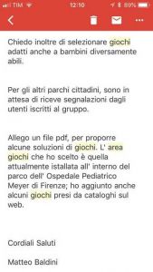 Scrive Matteo Baldani: “I giochi sono molto belli, e mi fa piacere quando l’ amministrazione mantiene la parola data; mi dispiace costatare che sono stati scelti tre giochi a torre fruibili sono per normodotati; è ovvio che i bambini disabili rimarranno a guardare i loro amici. Avevo suggerito a Marco Galigani di prendere come esempio i giochi dell’ ospedale Meyer perche sono frutto di studi e selezionati per far giocare tutti i bambini anche quelli meno fortunati. All’ assessore avevo mandato via email alcuni cataloghi di giochi adatti a tutti come esempio“.
