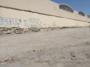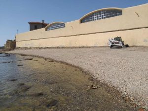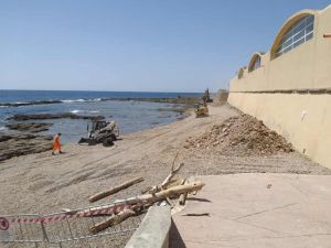 Sono stati accatastati rifiuti e anche dei tronchi d’albero portati sulla spiaggia dalle mareggiate, segnalati con del nastro segnaletico, in attesa della rimozione.