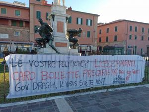Striscioni di protesta contro il governo Draghi e la sua politica sono apparsi ieri in varie parti della città. Sono stati esposti in occasione della visita del Ministro del Lavoro Andrea Orlando da alcuni lavoratori, rappresentanza sindacale (Usb) e comitato autonomo (Ex Caserma Occupata).