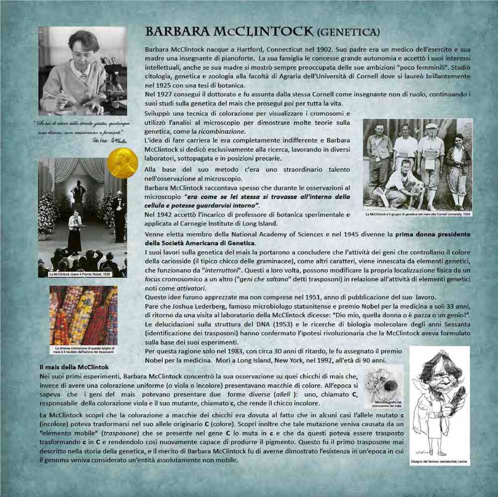 Barbara McClintock (1902-1992), biologa statunitense, scoprì i trasposoni, ovvero geni mobili, che possono modificare l’espressione del codice genetico e per questo ottenne il Nobel per la medicina nel 1983.