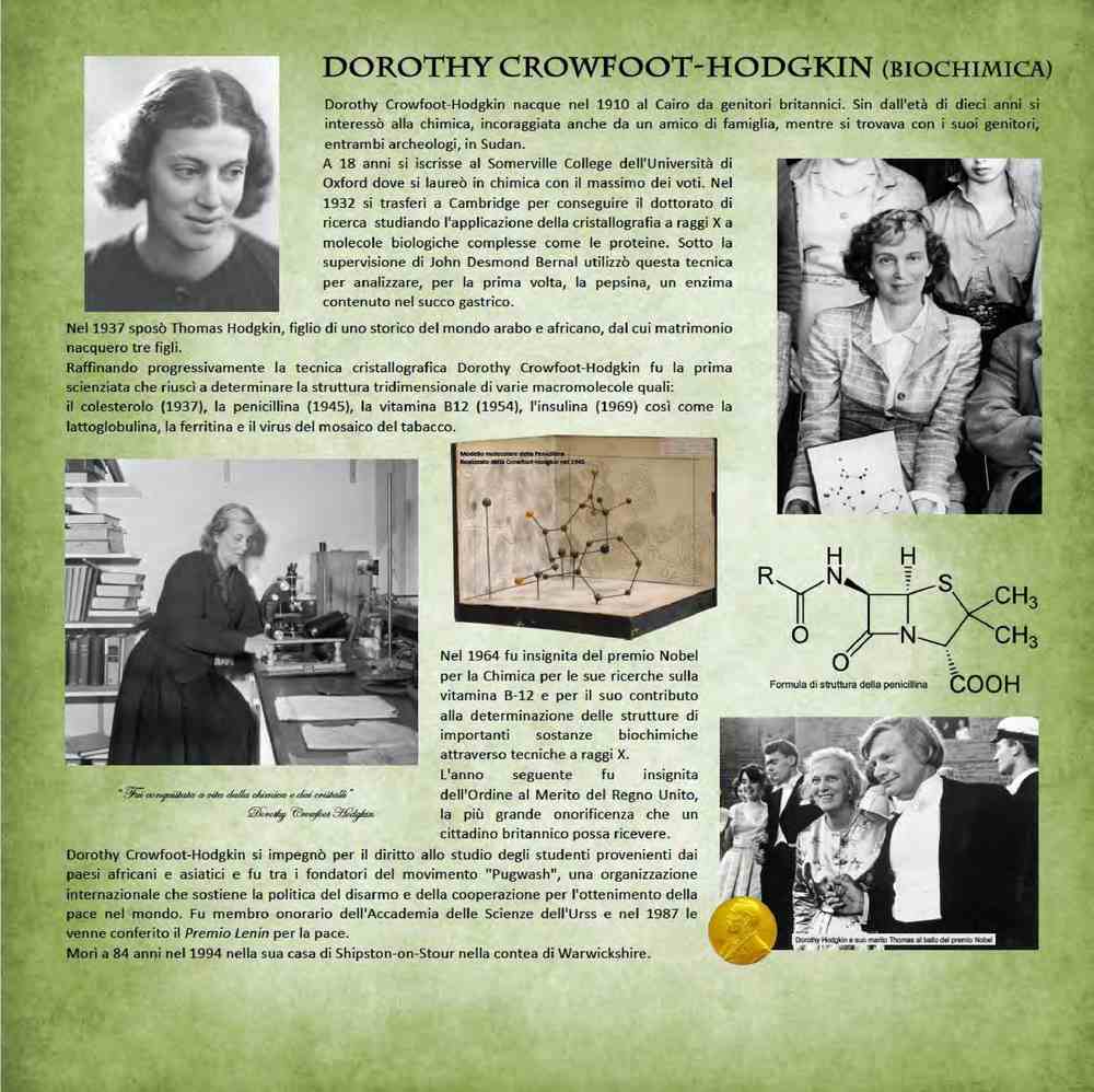 Dorothy Crowfoot-Hodgkin (1910-1994), biochimica britannica, studiò tramite la cristallografia a raggi X ormoni, vitamine e antibiotici e ottenne il Nobel per questi studi.