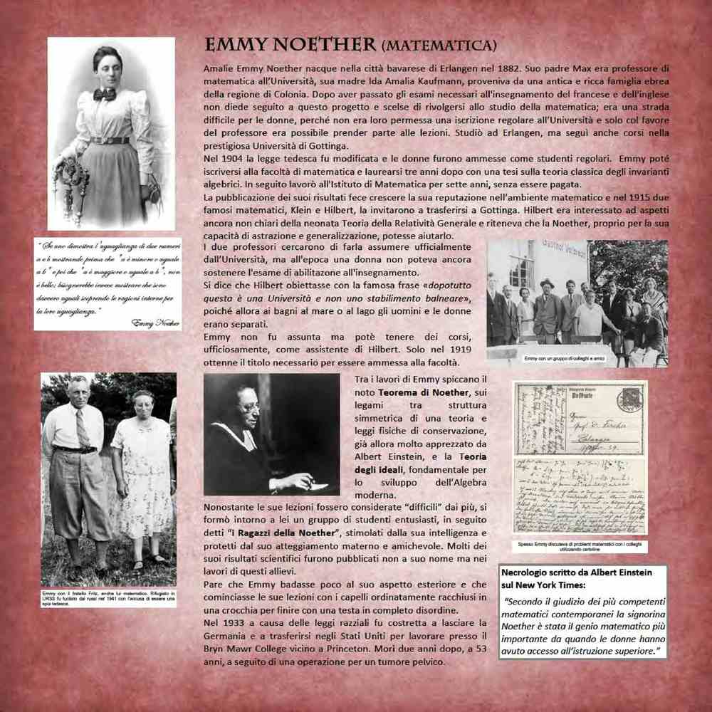 Questa esposizione, realizzata dall’associazione La Nuova Limonaia di Pisa, ha come obiettivo la diffusione della conoscenza di donne che hanno contribuito in modo significativo o anche decisivo al progresso scientifico a tutti i livelli, in una varietà di ambiti del sapere.