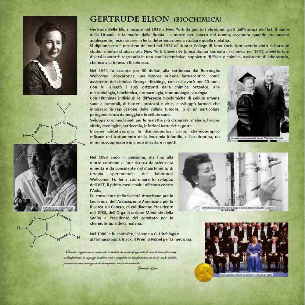 Gertrude Elion (1918-1999), biochimica statunitense, ricevette il premio Nobel per la medicina nel 1988 per la scoperta di trattamenti per leucemia, malaria e sindrome di immunodeficienza acquisita.