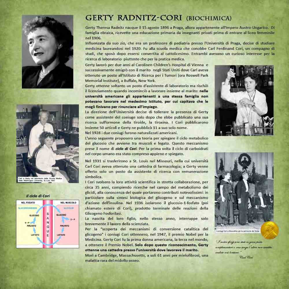 Gerty Radnitz-Cori (1896-1957), biochimica ceca, ricevette il premio Nobel per la medicina nel 1947 per lo studio del metabolismo del glicogeno nelle cellule muscolari.