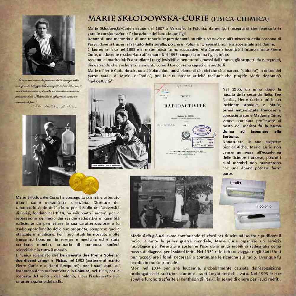 Marie Skłodowska-Curie (1867-1934), chimica e fisica polacca, scoprì il fenomeno della radioattività e isolò degli isotopi radioattivi (radio e polonio).