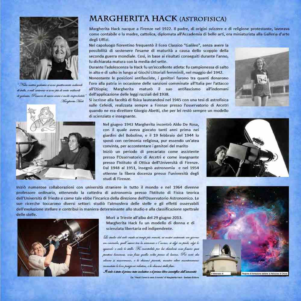 Margherita Hack (1922-2013), astrofisica italiana, fu direttrice dell’Osservatorio astronomico di Trieste e divulgatrice scientifica.