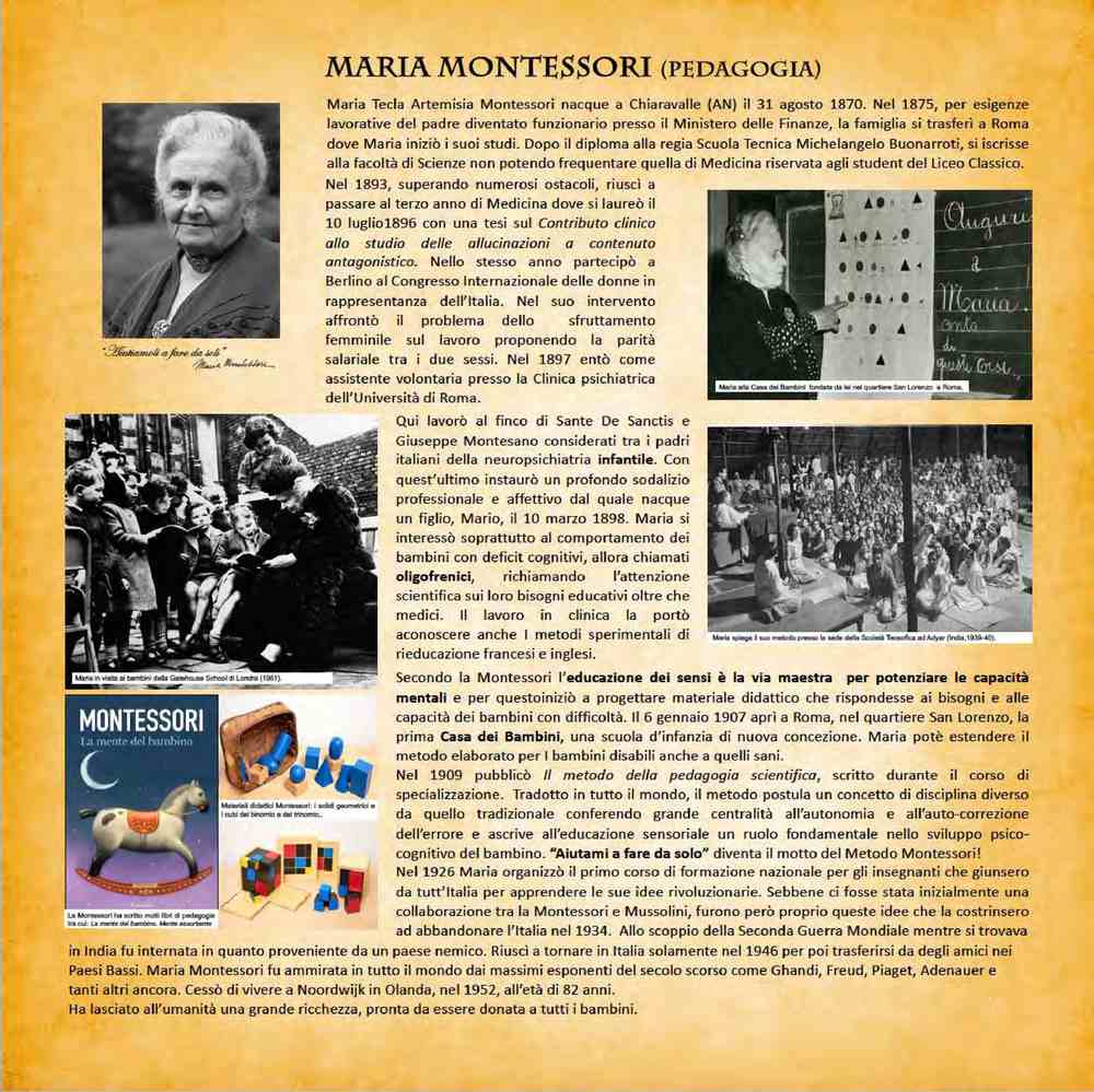 Maria Montessori (1870-1952), pedagoga, fu una promotrice della pedagogia scientifica e fondò il metodo Montessori, una metodologia didattica basata sull’iniziativa autonoma del bambino.