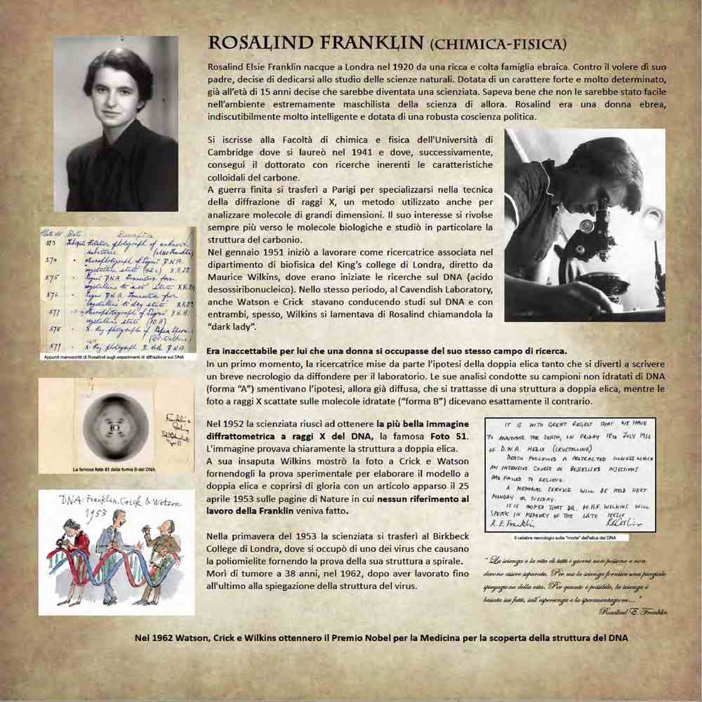 Basti ricordare Rosalind Franklin, la chimica che scoprì la struttura a doppia elica del DNA, morta prematuramente a 38 anni prima di potersi aggiudicare un meritato premio Nobel per la medicina; oppure a Lise Meitner, che contribuì a determinare l’esistenza del fenomeno della fissione nucleare, amica di Otto Hahn il quale fu l’unico ad aggiudicarsi il premio Nobel 1944 per la chimica. Più fortunata è stata l’italiana Rita Levi Montalcini, che fu insignita del premio Nobel 1986 per la medicina grazie alla scoperta dell’NGF, una proteina che ha un ruolo molto importante nello sviluppo embrionale ed è studiata per la cura a malattia neurologiche e neoplastiche.