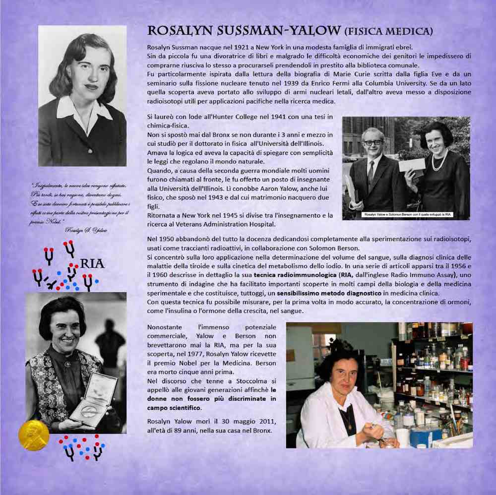 Rosalyn Sussman-Yalow (1921-2011), fisica medica statunitense, ottenne il premio Nobel nel 1977 per l’invenzione della tecnica del dosaggio radioimmunologico, la cui funzione era la somministrazione di piccole dosi di biomolecole, come l’insulina per la cura dei diabetici.