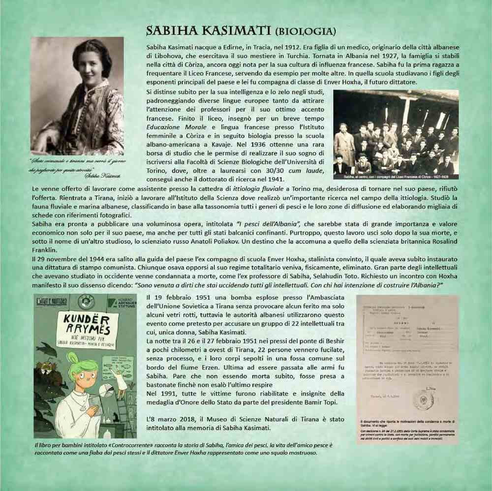 Sabiha Kasimati (1912-1951), biologa albanese, fu ittiologa e studiò per decenni la fauna ittica del suo paese natale.