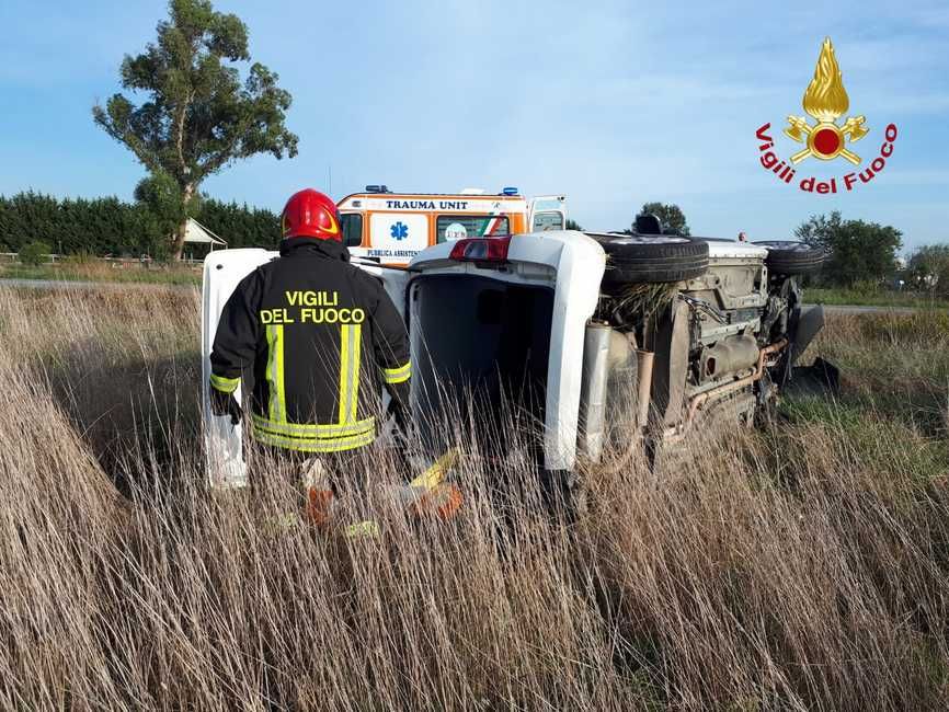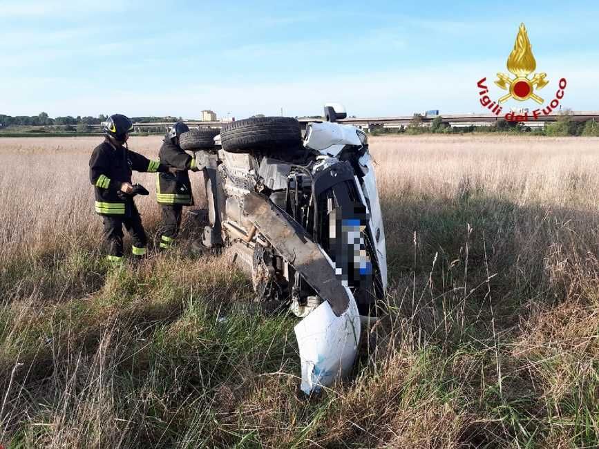 Per cause ancora in via di accertamento una autovettura è uscita di strada, finendo in un campo adiacente alla carreggiata e rovesciandosi su un fianco.