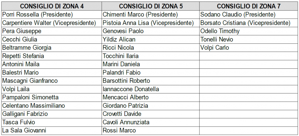 Per il Consiglio di Zona n. 1 è stato nominato presidente il signor Giuseppe Barbato e come vicepresidente il signor Fabio Giachetti ; per il Consiglio di Zona n. 2 è stato nominato presidente il signor Esteljano Zanaj e come vicepresidente la signora Francesca Nori; per il Consiglio di Zona n. 3 è stata nominata presidente la signora Clara Sforza e come vicepresidente e il signor Mauro Meini; per il Consiglio di Zona n. 4 è stata nominata presidente la signora Rossella Porri e come vicepresidente il signor Walter Carpentiere; per il Consiglio di Zona n. 5 è stato nominato presidente il signor Marco Chimenti e come vicepresidente la signora Anna Lisa Pistoia; per il Consiglio di Zona n. 7 è stato nominato presidente il signor Claudio Sodano e come vice presidente la signorara Cristiana Borsato.