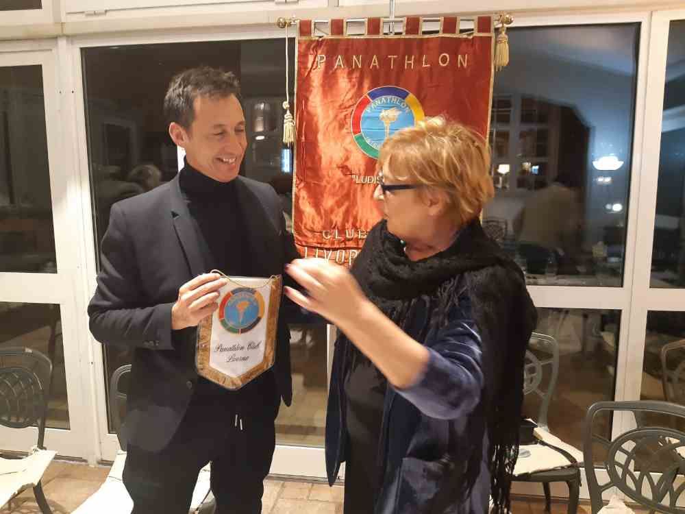 La presidente del Panathlon livornese, Daniela Becherini, ha consegnato al maestro Zanotti il gagliardetto del Club ricordando che “un tecnico come Zanotti, per i valori che esprime, per l’abnegazione che ha mostrato prima da schermidore e adesso come maestro d’arma, è l’uomo giusto per incarnare i valori e l’esempio del Panathlon”.