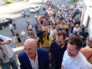 Livorno 10 giugno 2024 – Il rieletto sindaco Luca Salvetti tra abbracci e acclamazioni arriva in Comune (Video)
