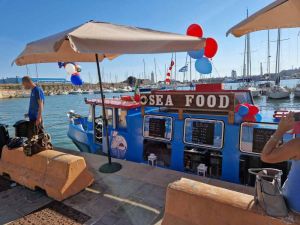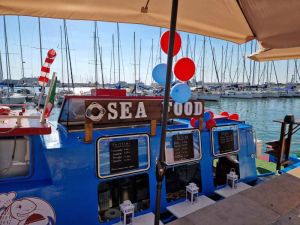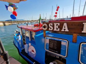 La barca e stata concepita come Sea Food, frittini di gamberi e totani, alghe fritte, baccala, panini di mare, fish and chips e tanto altro.