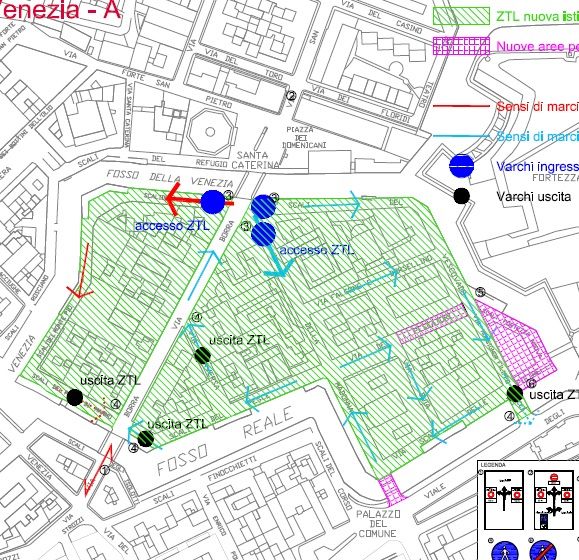 I quattro varchi in uscita sono all’intersezione tra via Mons. Ganucci e via Avvalorati, all’intersezione tra via Traversa e via Borra, all’intersezione tra scali del Pesce e via Borra, all’intersezione tra scali del Ponte di Marmo e via Borra.