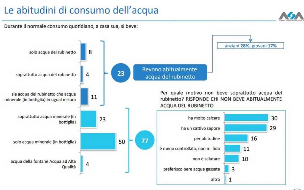 Il settantasette per cento del campione intervistato per conto di Asa non beve l’acqua del rubinetto. È questo uno dei dati principali emersi dal bilancio socio ambientale 2018 e dall’indagine sulle abitudini del consumo di acqua. Solo il 4% utilizza l’acqua delle fontanelle alta qualità, segnalando come l’acqua dei rubinetti abbia molto calcare (30%) e/o un cattivo sapore (29%). C’è tuttavia un buon margine di crescita del 16%, costituito da coloro che non usano l’acqua potabile in casa solo “per abitudine”.