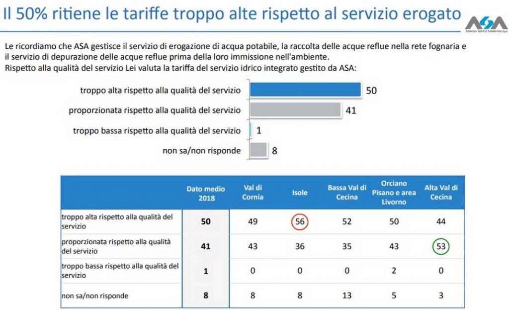 Il campione intervistato complessivo comprende 1.180 famiglie. Il campione iniziale era costituito da 882 famiglie clienti del servizio idrico di ASA residenti nel territorio servito, suddivise proporzionalmente nelle 5 aree già identificate come significative per la segmentazione. E’ stato effettuato in più un sovracampionamento di 298 casi al fine di aumentare le basi dei subcampioni di fruitori dei servizi tecnici e di clienti che hanno contattato ASA tramite call center, online o sportello fisico. I dati sono stati ponderati in modo da evitare distorsioni dovute al sovracampionamento e alle proporzioni tra le interviste telefoniche e online. In questo modo i dati sono confrontabili con gli indicatori analoghi rilevati negli anni precedenti. Val di Cornia 189 , Isole 107 , Bassa Val di Cecina 266, Orciano, Pisano e area di Livorno 546, Alta Val di Cecina 72. Totale 1180.
