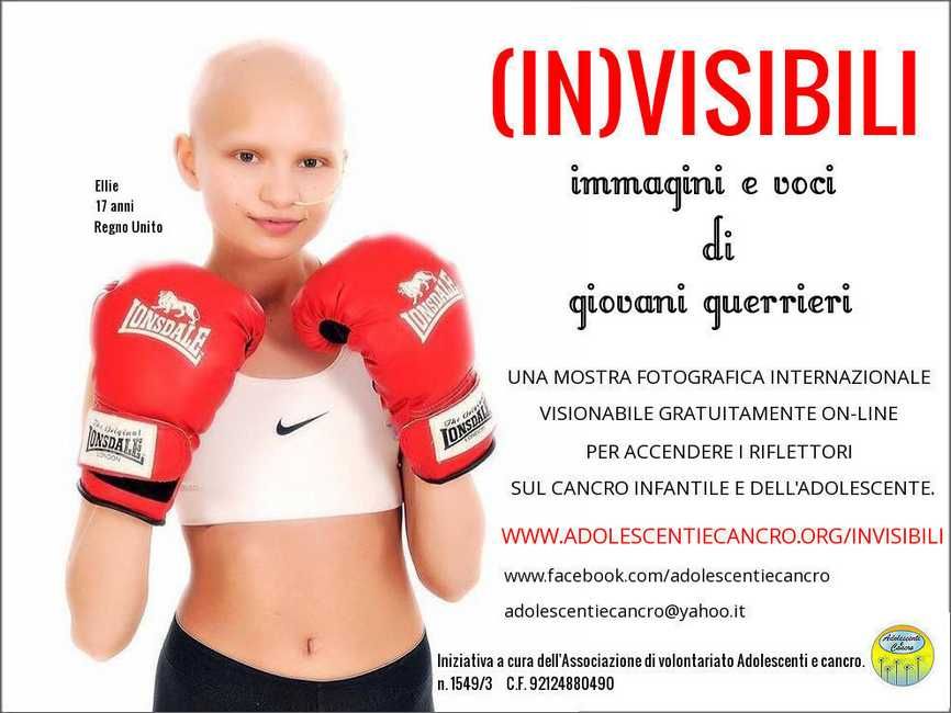 L’associazione di volontariato Adolescenti e cancro (con sede a Rosignano Solvay, LI) che offre attività ricreative gratuite a ragazzi che hanno o hanno avuto una malattia oncologica e lavora durante tutto l’anno per fare corretta sensibilizzazione sul cancro infantile e dell’adolescente, ha lanciato la mostra fotografica internazionale on-line “(IN)VISIBILI – immagini e voci di giovani guerrieri” che raccoglie foto e testi inviati dai ragazzi o dai famigliari provenienti da Italia, Regno Unito, Svizzera e Venezuela.