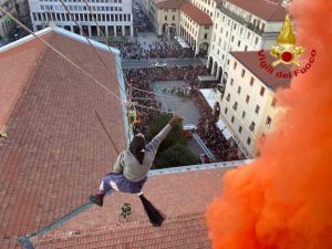 E’ stato necessario approntare una teleferica dal campanile della chiesa per permettere alla Befana, assistita dal personale SAF (speleo, alpino, fluviale) del Comando di Livorno, di raggiungere la piazza dove ha potuto distribuire dolcetti ai bambini.