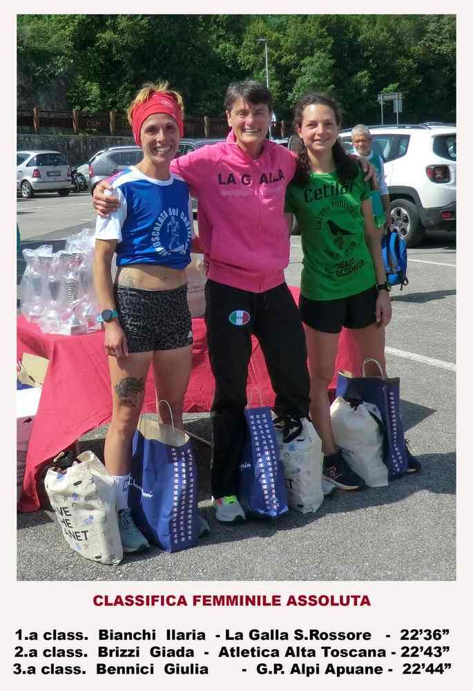 Fra le donne spunta un’altra atleta molto conosciuta a livello locale e non solo, Ilaria Bianchi (La Galla Parco San Rossore) che in 22’36” ha prevalso per 7” su Giada Brizzi (Atl.Alta Toscana) e per 8” su Giulia Bennici (Gp Parco Alpi Apuane) che per un solo secondo ha tolto il podio a Claudia Astrella (Atl.Vinci).