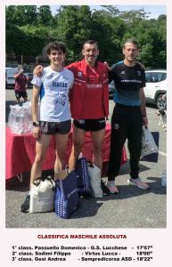 La corsa di Montenero Basso, portata dagli organizzatori proprio nelle ultime ore a 5,1 km, ha visto emergere il portacolori del Gs Lucchese che ha fermato i cronometri sul tempo di 17’57”, facendo meglio di appena 4” rispetto a Filippo Sodimi (Virtus Lucca), mentre terzo ha chiuso in classifica Andrea Gesi (Sempredicorsa), personaggio storico del podismo toscano, a 26”.