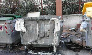 La foto: Buongiorno da via Santa Fortunata. Cassonetto bruciato.