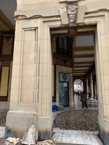 La foto: Cade pezzo di cornicione dai portici in via Cairoli