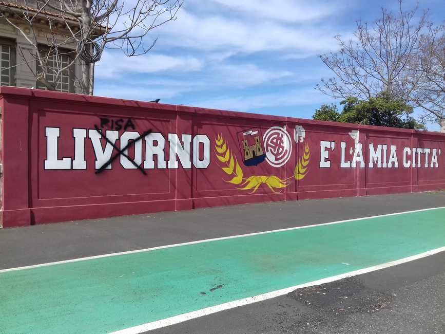 Sulla parola bianca “Livorno” è stata disegnata una X nera come a cancellare la parola; al suo posto sempre in nero è apparsa sul muro la scritta “Pisa”. Prove tecniche di provincia allargata?