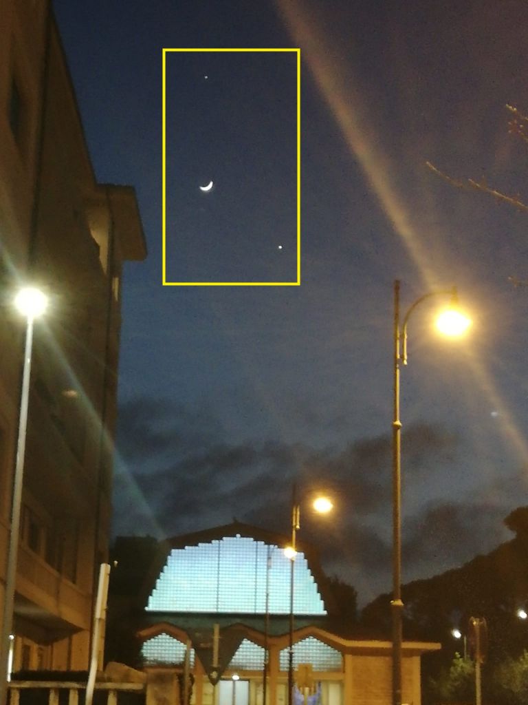Nella foto scattata con un cellulare da piazza Aldo Moro, Venere è il puntino luminoso in basso a destra sotto la Luna mentre Giove si trova in alto proprio sopra la falce della luna