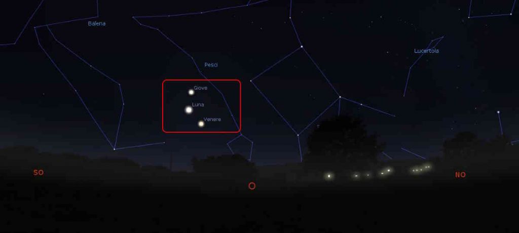 Ricordiamo infatti che il piccolo pianeta roccioso è il terzo oggetto più luminoso della volta celeste, dopo il Sole e la Luna, pertanto è sempre il primo puntino luminoso del cielo serale a comparire (quando è presente). Giove è arrivato poco dopo, trattandosi del quarto oggetto più luminoso: diventando visibile circa 10 minuti dopo il Pianeta dell’Amore, dando così inizio alla triplice congiunzione astrale nella costellazione dei Pesci