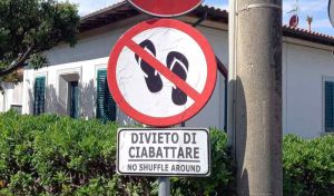Da qualche giorno è presente a Castiglioncello nel comune di Rosignano Marittimo un cartello ironico che vieta il ciabattare.