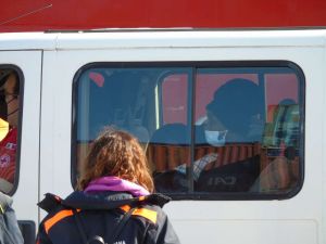 Salutano. Sorridono. Gioca. E dietro al vetro del pulmino si allunga per cercare un contatto con la mano di uno dei soccorritori.