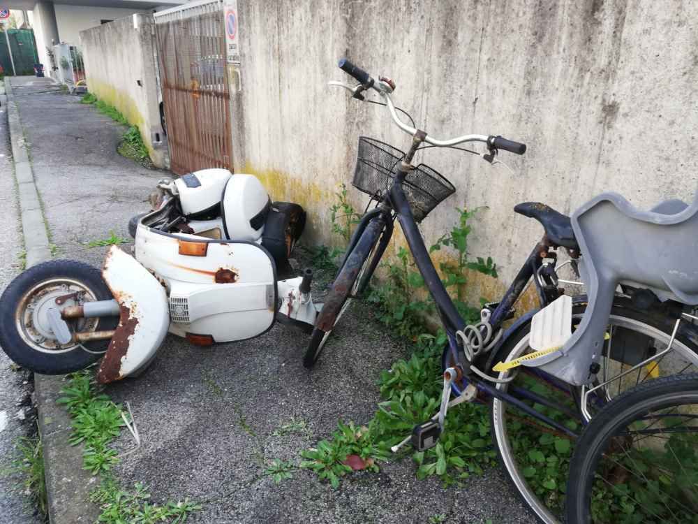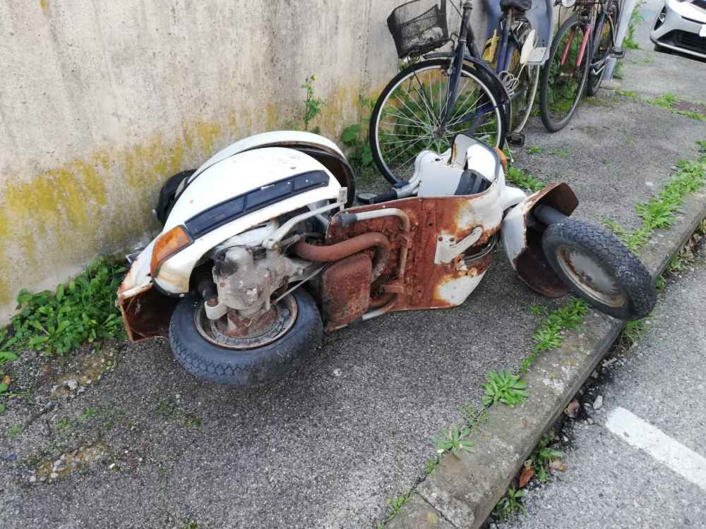 Di seguito le foto che mostrano una Vespa PX senza targa abbandonata su un marciapiede in via del Fantasia a Livorno