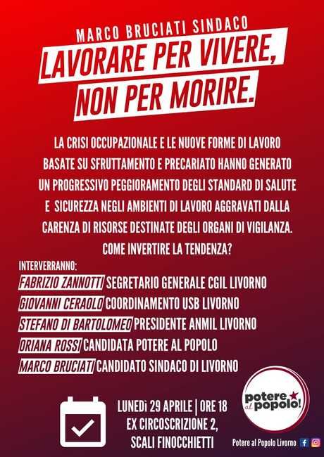 Livorno – Potere al Popolo ha organizzato per lunedì 29 aprile un dibattito “Lavorare per vivere, non per morire”