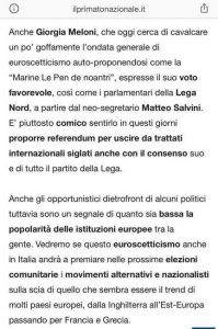 La Meloni (cito “il primato nazionale” apposta e non la Pravda) è una sovranista del giorno dopo, fino a ieri insieme a tutta la sua politica di governo di cui ha fatto parte si mettevano a 90º con i poteri europei, altro che sovranità, l’ha svenduta con tutti i trattati votati.
