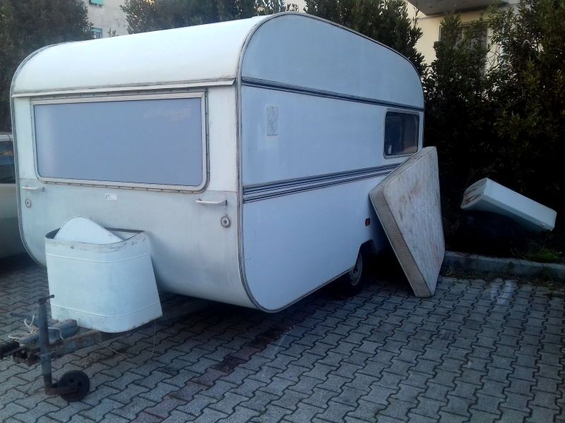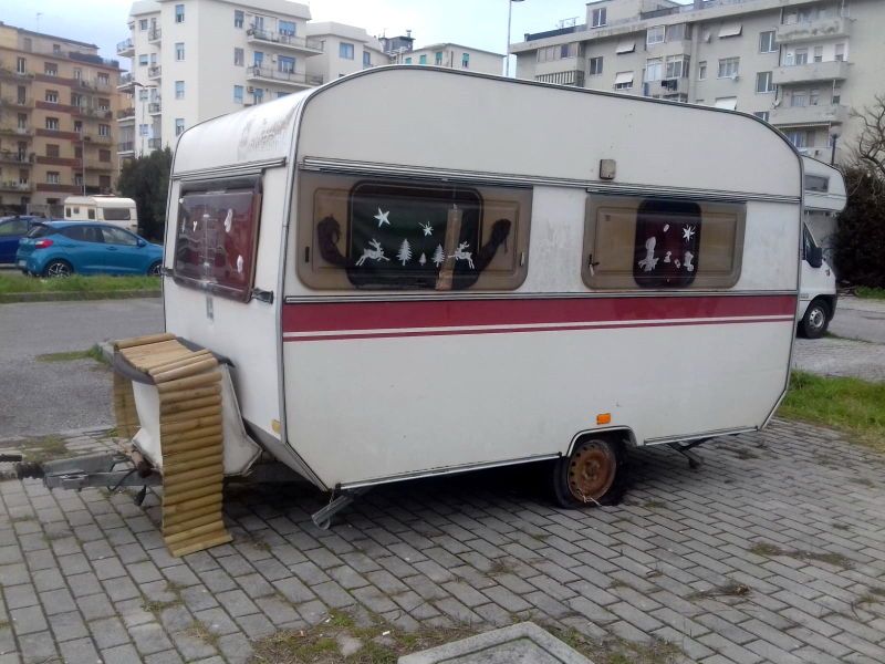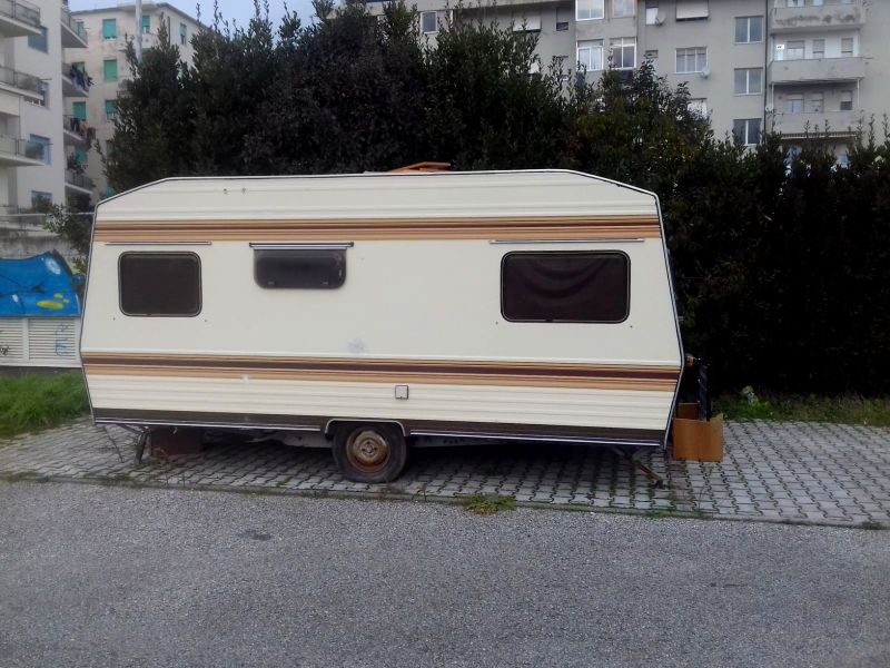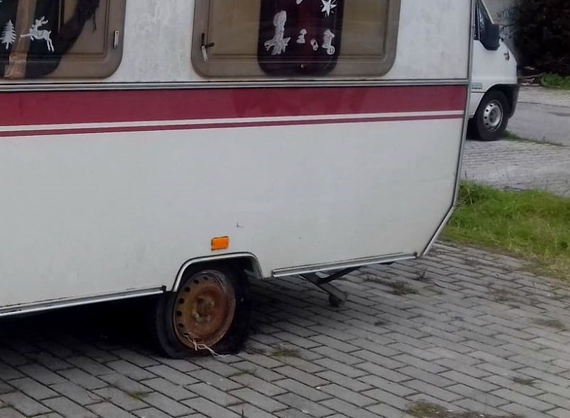 In queste immagini possiamo vedere una roulotte sul marciapiede. Nella foto più piccola si vede la ruota a terra del mezzo e – purtroppo si nota male – ma è anche parzialmente bruciata (a testimonianza del tempo che è lì)