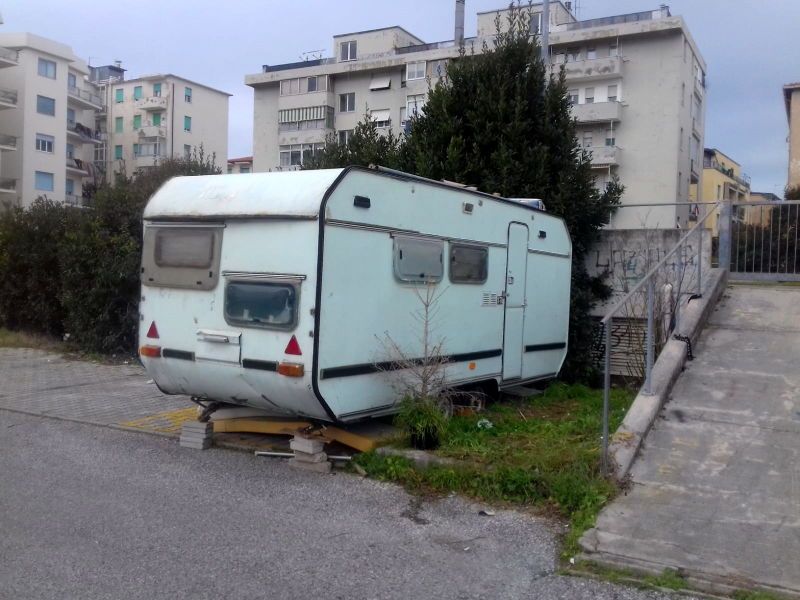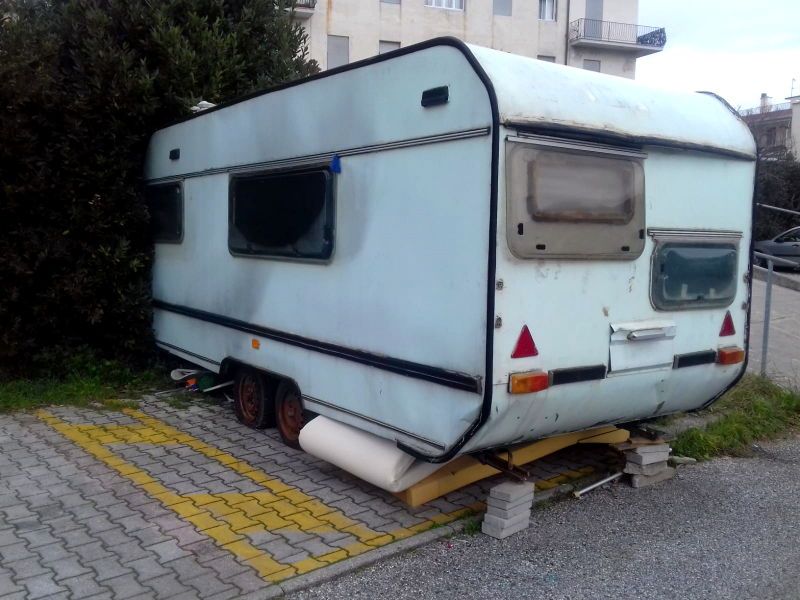 Qui invece possiamo vedere una roulotte parcheggiata da mesi su un posto contrassegnato dalla segnaletica orizzontale gialla per i disabili