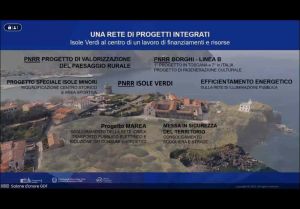 Riguardo al progetto Isole Verdi che porterà sull’Isola 4.844.849,00 € sono stati illustrati gli interventi principali tra cui: l’adeguamento del centro di raccolta, l’implementazione del sistema di mobilità sostenibile, la realizzazione di un nuovo impianto di dissalazione più performante e ampliabile e la sostituzione di diversi tratti di condotta idrica, interventi di efficientamento energetico sugli edifici pubblici e la riduzione delle isole di calore e infine la creazione di una comunità energetica rinnovabile (CER) associata a una infrastruttura per il monitoraggio e la gestione.