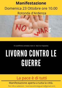 “No Wars, la pace è di tutti, il conflitto armato non è mai la risposta”. Livorno contro le guerra organizza domenica 23 ottobre alle ore 10. 00 una manifestazione pubblica alla Rotonda di Ardenza