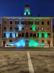 Luci blu e verdi sulla facciata del Palazzo Comunale per la Giornata Internazionale sulle Neurofibromatosi