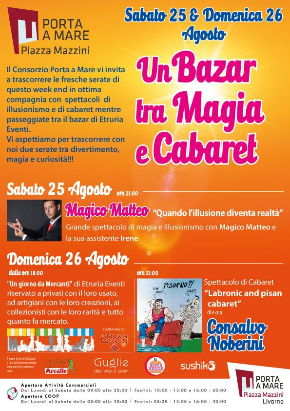 Informazione pubblicitaria – Sabato 25 e domenica 26 agosto il Consorzio Porta a Mare propone un week end tra spettacoli di magia e intrattenimento comico di Consalvo Noberini.