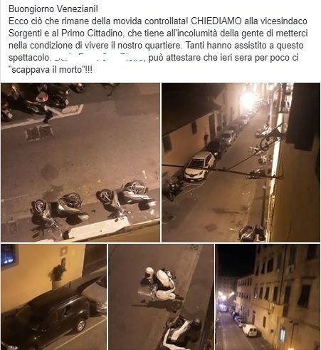Il parroco di Santa Caterina in un post sul gruppo Facebook Vivi la Venezia scrive: “Ecco ciò che rimane della movida controllata! Chiediamo alla vicesindaco Sorgente e al primo cittadino, che tiene all’incolumità della gente di metterci nella condizione di vivere il nostro quartiere. Tanti hanno assistito a questo spettacolo. ieri sera per poco ci “scappava il morto”!!!