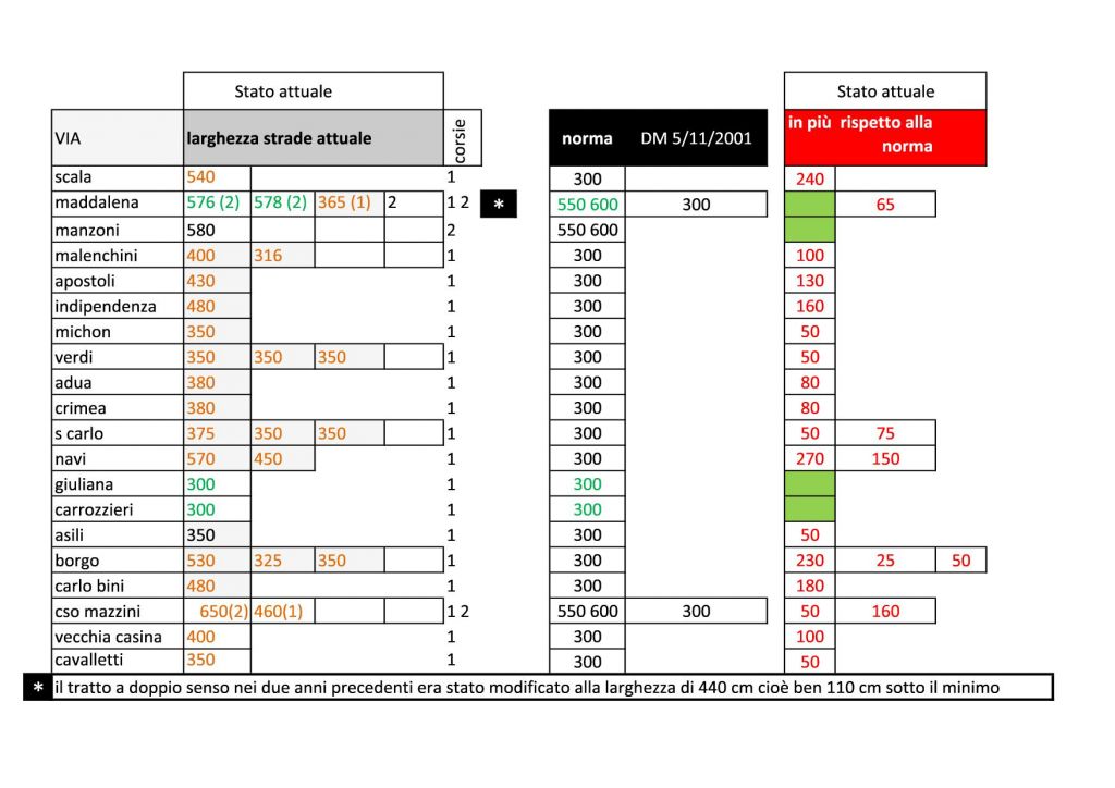 E’ sotto gli occhi di tutti che l’attuale amministrazione, facendo a meno di rinnovare un piano del traffico vecchio ben 18 anni, privando i cittadini del loro diritto di essere coinvolti nei passaggi progettuali e decisionali a riguardo, ha proceduto sia all’eliminazione di centinaia di posti auto che ad allargare la larghezza minima delle carreggiate da 3,00 m a 3,50 m, adducendo di essere “costretta” da indicazioni del corpo dei Vigili del Fuoco per la sicurezza dei cittadini ( n.b. giustissimo se le carreggiate fossero percorse solo dai mezzi di soccorso)