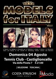 Presentato in Confcommercio da Costa Etruschi Model Agency il concorso Models For Italy Toscana della Gianni Maser Production, le cui selezioni porteranno gli aspiranti modelle e modelli finalisti sui canali nazionali alla presenza di talent scout e celebrità. In particolare si è parlato della tappa che avrà luogo al Tennis Club Castiglioncello il 4 agosto alle 21:00.