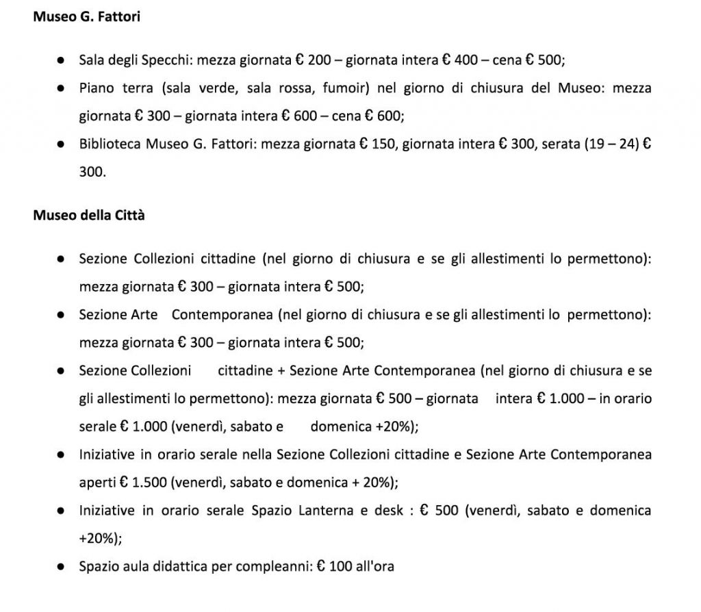 Sono state adeguate con l’occasione anche le tariffe di locazione degli altri spazi propri del polo museale civico. Ecco qui di seguito il nuovo tariffario.