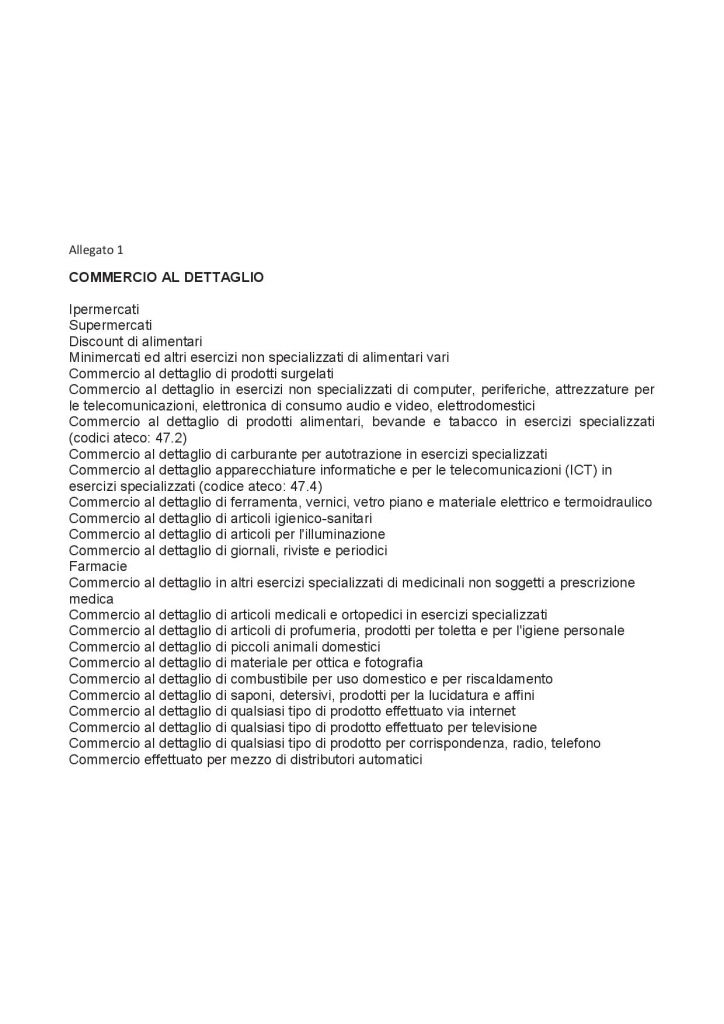 Rispetto a quanto detto brevemente dal Presidente del Consiglio nella sua dichiarazione in tv, vi sono diverse categorie di negozi che possono rimanere aperte. Tra queste i negozi di elettronica, le pompe di benzina, le tabaccherie, i negozi di saponi, le edicole, le profumerie, i ferramenta, gli ottici e le lavanderie. Rimangono chiusi i negozi di abbigliamento, i quali non sono ricompresi nella lista allegata al decreto. A conti fatti non appare una chiusura così radicale come poteva sembrare dalle parole del presidente Conte.